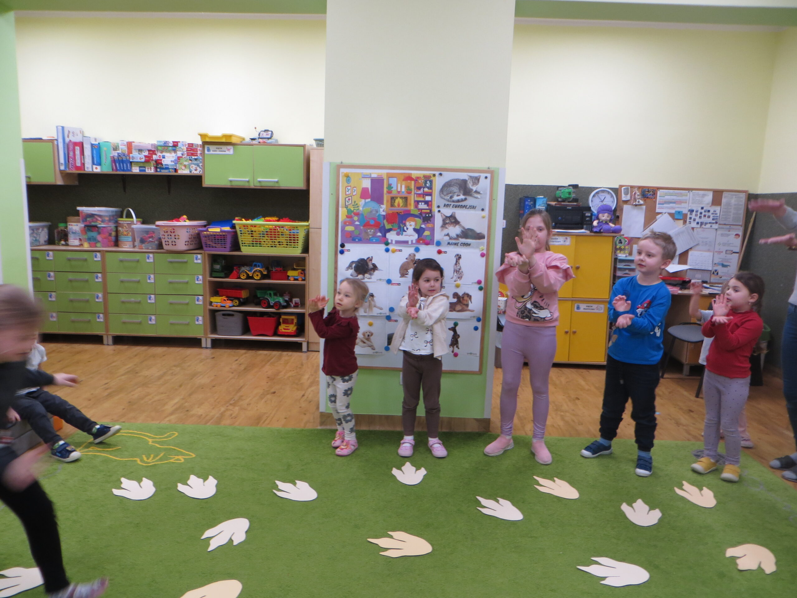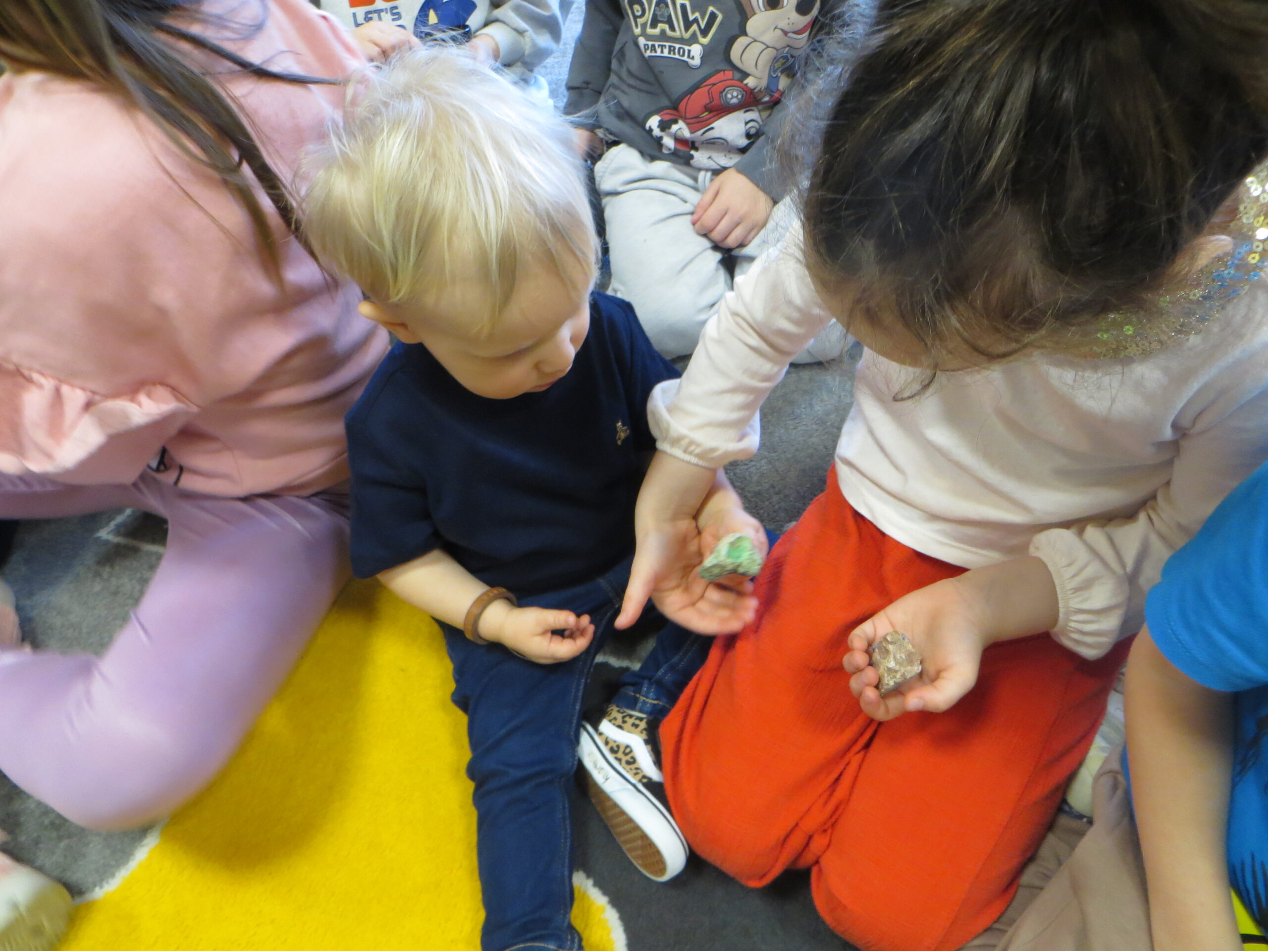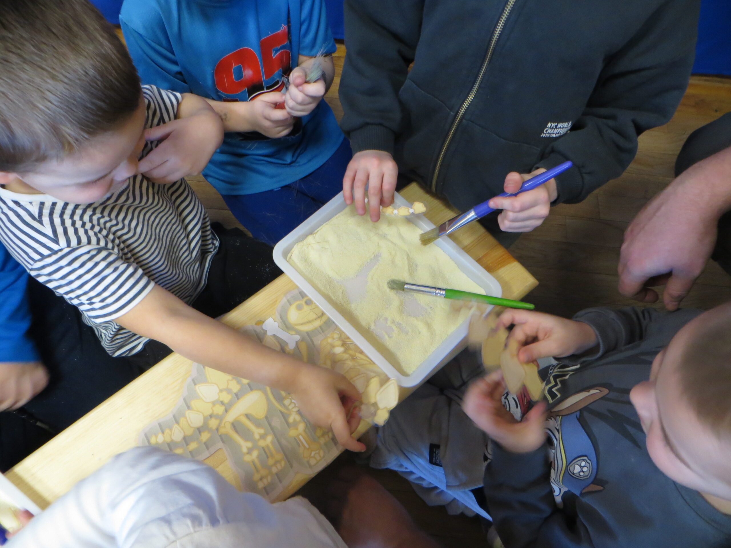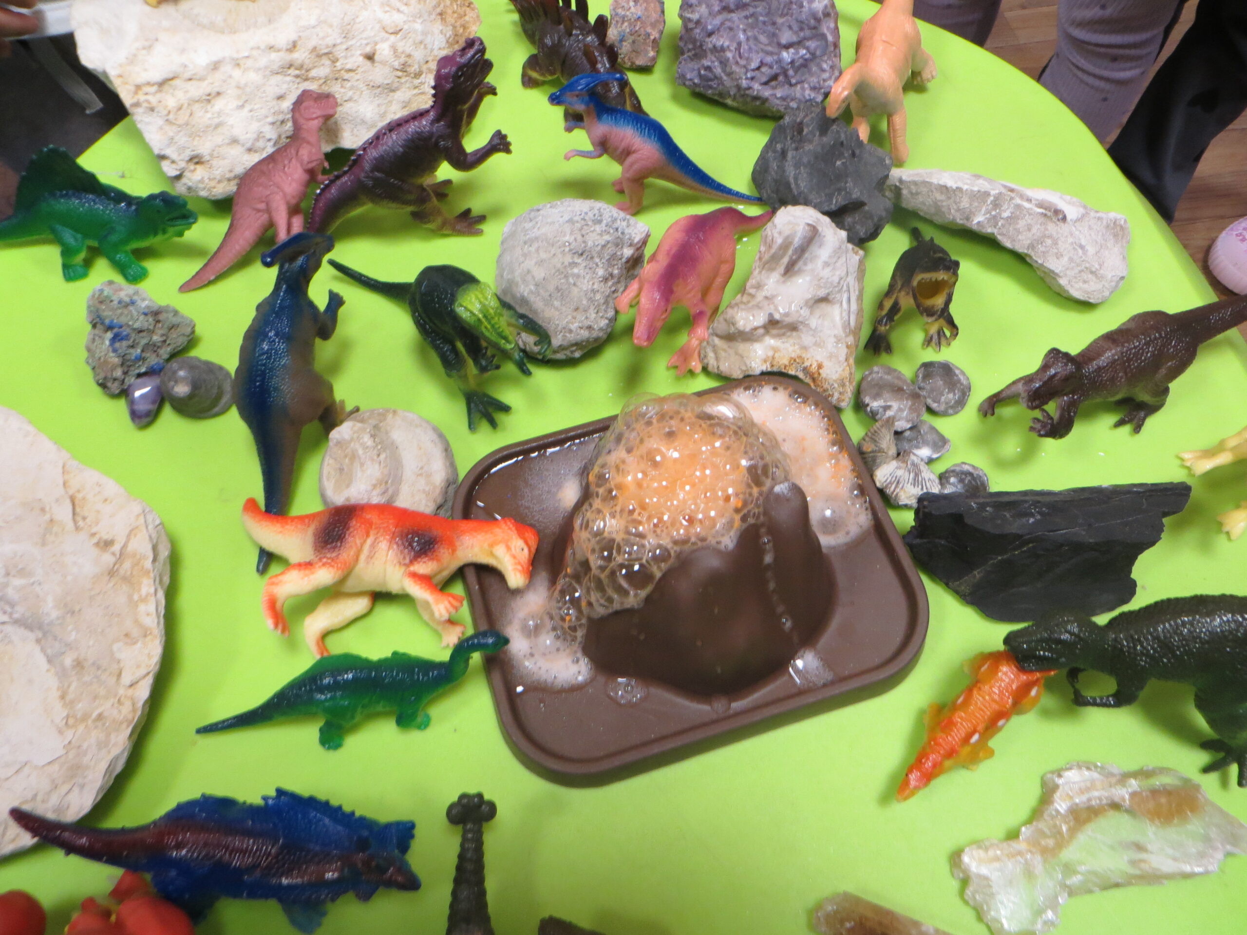 Ostatnio nasze przedszkole opanowała „dino-mania”! Z okazji Dnia Dinozaura odwiedził nas niezwykły gość – pan geolog, który odkrył przed dziećmi tajemnice ukryte w skałach. Dzieci z zachwytem oglądały prawdziwe skamieliny i mieniące się minerały. Wykonały wspólnie doświadczenie z wybuchającym wulkanem. Z pędzlami w dłoniach przedszkolaki bawiły się w paleontologów, wydobywając z piasku „kości” prehistorycznych gadów. Na zakończenie galerie wypełniły się własnoręcznie wykonanymi dinozaurami. Oczywiście nie mogło zabraknąć zabaw ruchowych i piosenek o dinozaurach.