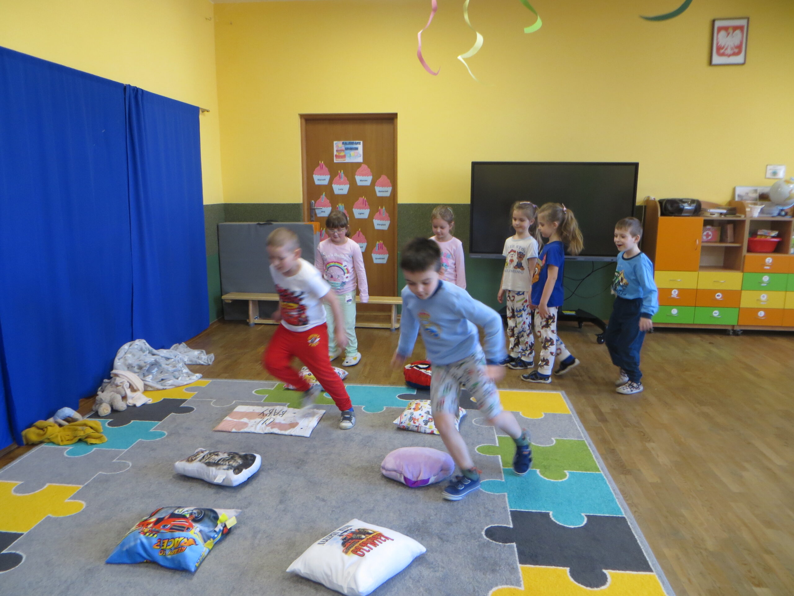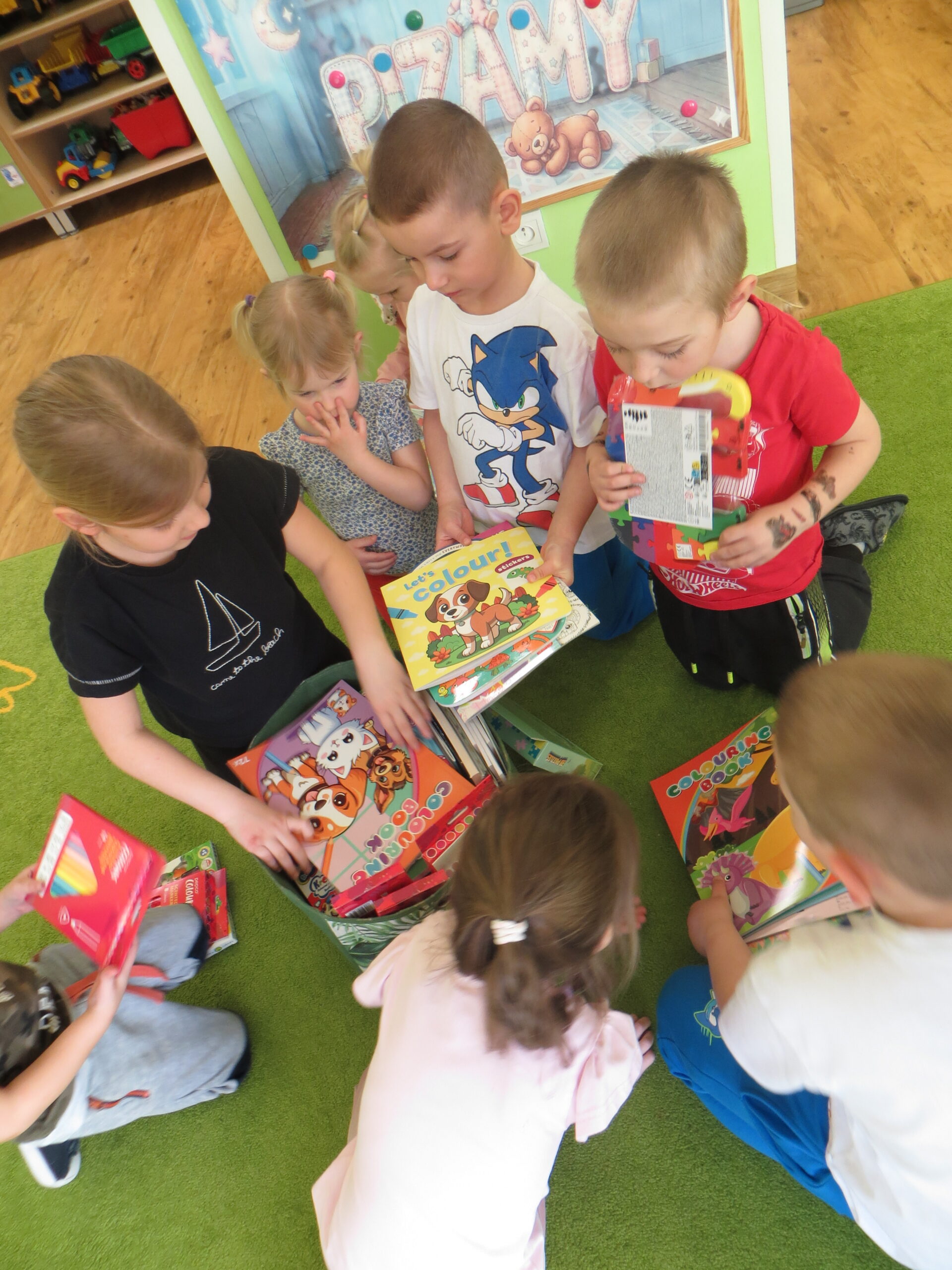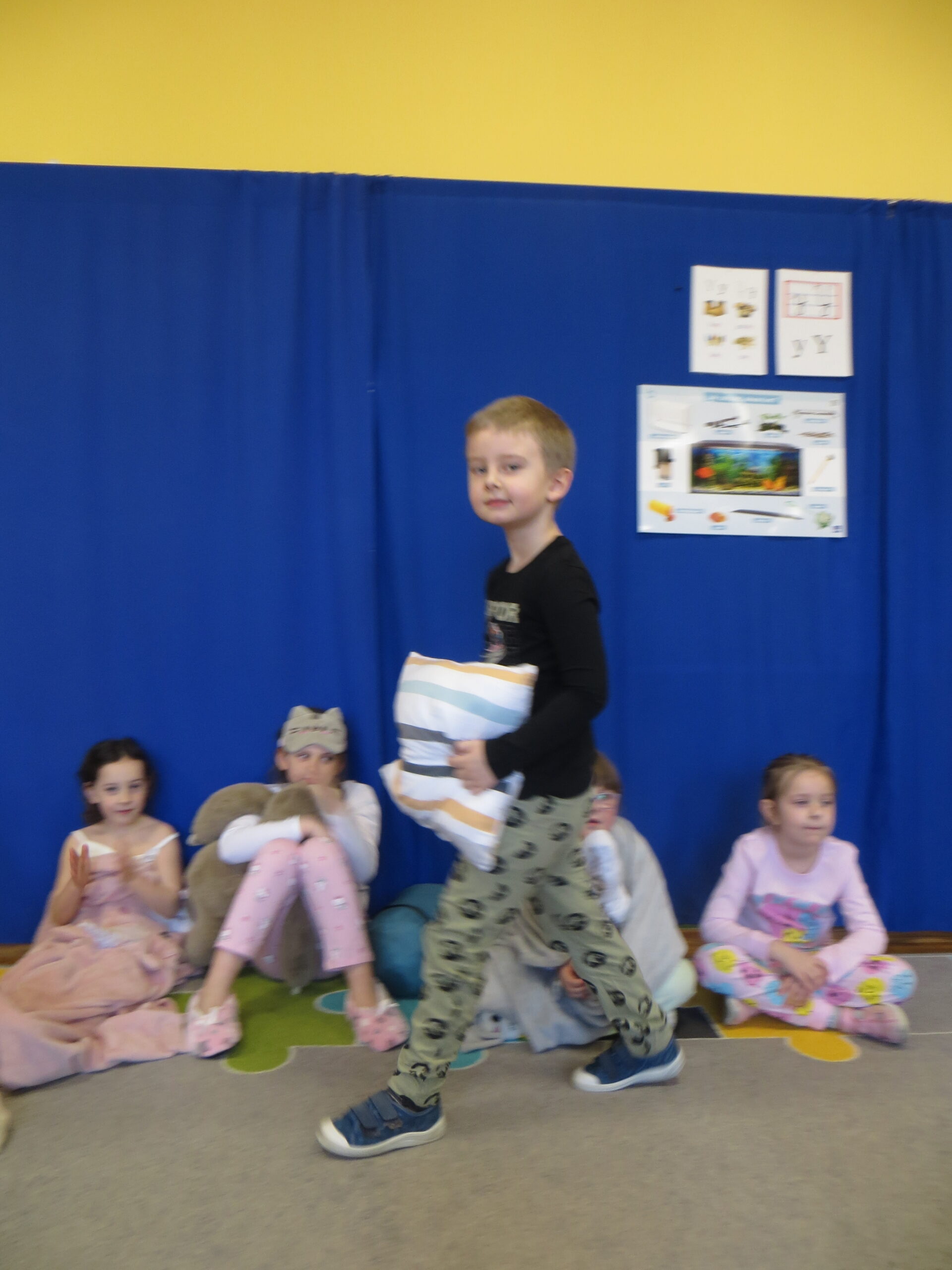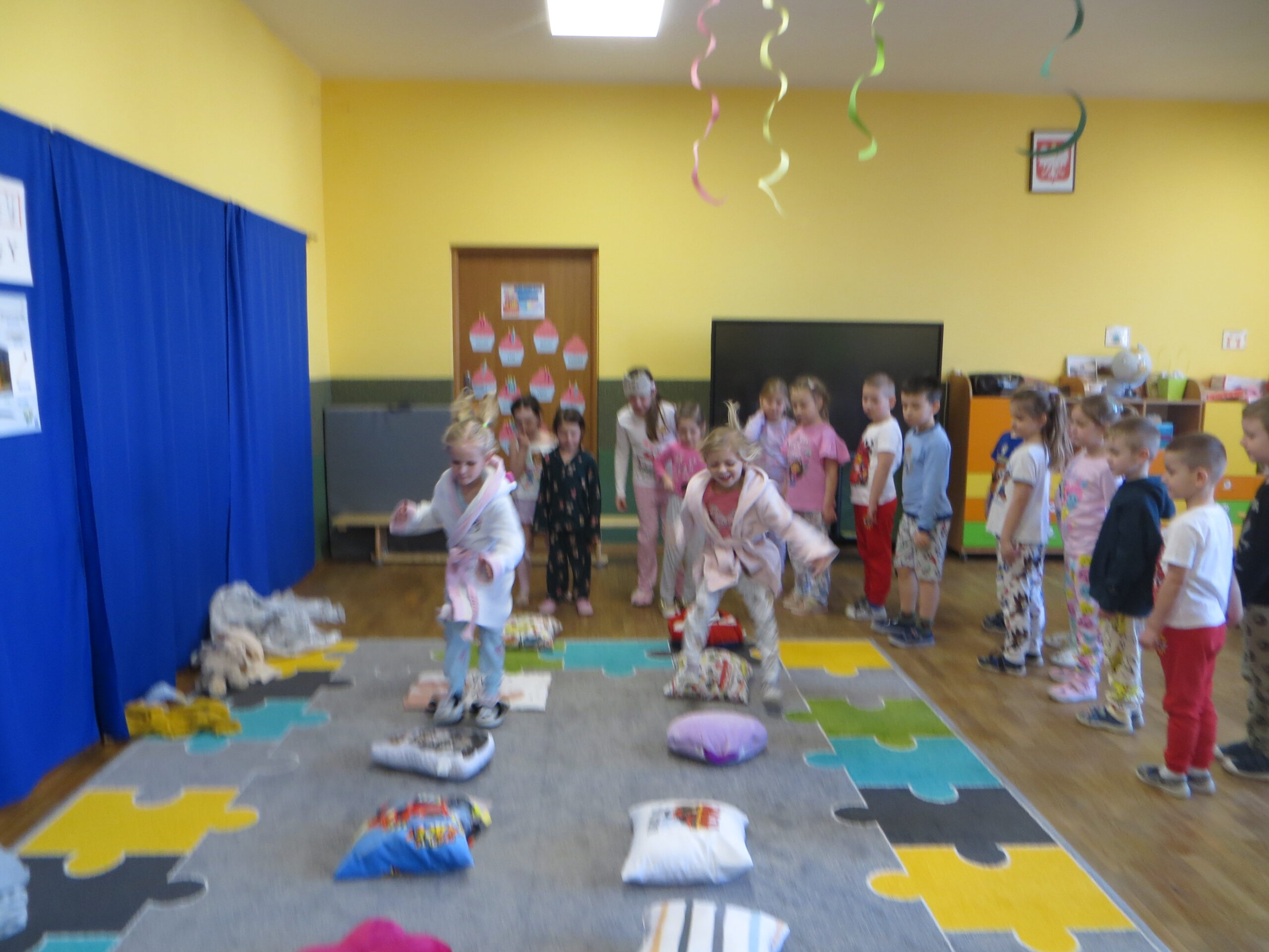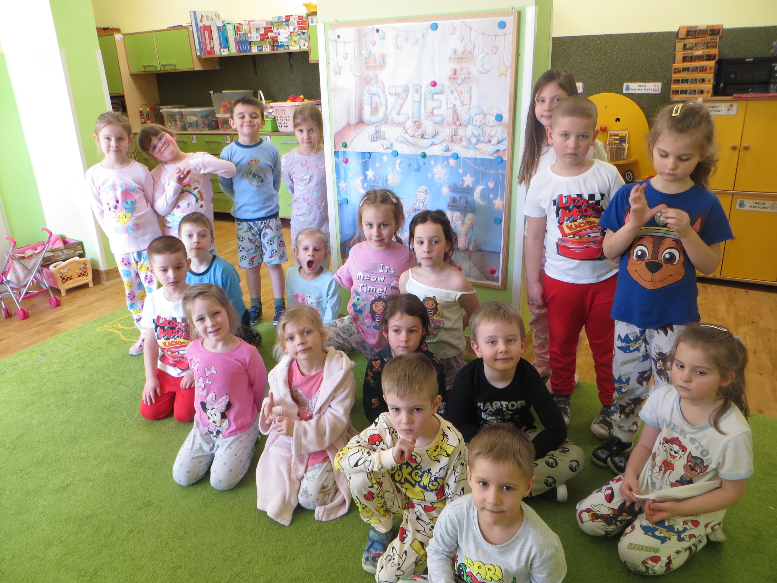 W czwartek nasze przedszkolne sale zamieniły się w najbardziej przytulne miejsce na świecie! Obchodziliśmy Dzień Piżamy, który przyniósł dzieciom mnóstwo radości i wzruszeń. Od samego rana podziwialiśmy kolorowe stroje – od puszystych kombinezonów po piżamki w superbohaterów. Od samego rana podziwialiśmy kolorowe stroje – od puszystych kombinezonów po piżamki w superbohaterów. Energii dodały nam wesołe zabawy ruchowe oraz emocjonujące wyścigi z poduszkami. Po szaleństwach przyszedł czas na zasłużoną odpoczywankę. Dzieci zrelaksowały się na dywanie z ulubionymi poduszkami i kocykami, słuchając bajek. Najważniejszym punktem dnia było wykonanie wspólnej książeczki. Każdy przedszkolak przygotował rysunek pełen dobrych myśli, które przekażemy dzieciom przebywającym w szpitalach. Chcieliśmy w ten sposób pokazać, że piżama może kojarzyć się z zabawą, a nie tylko z chorobą. Rodzice również włączyli się w naszą akcję organizując zbiórkę materiałów plastycznych. Wszystkim ofiarodawcom dziękujemy.